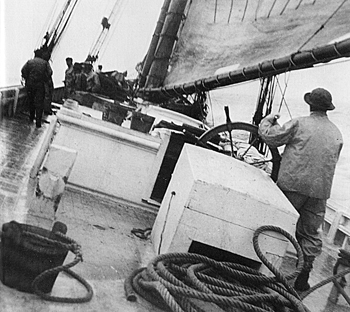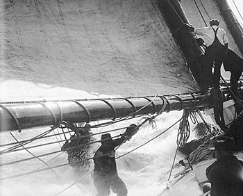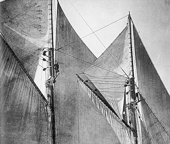 Mastheadmen perched like birds. The mastheadman unfurls the topsails so they can be set by the halyards from the deck. The foremastheadman also carries the tack and clew of the fore topsail up and over the main top mast stay (between the masts) when the boat comes about on the other tack. It was this stay that Sterling Hayden was noted for crossing hand over hand to cover fore and main positions. With a stiff breeze and a sea running required nerves of steel and near perfect preci-sion on deck and aloft. (Cape Ann Historical Assoc.)