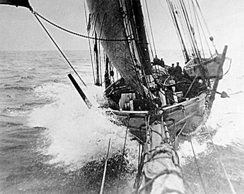 A crewman’s view of the boat from a position on the bowsprit where head sails were set. The bowsprit regularly plunged through swells. Men were often washed off leading it to be known as the widowmaker. Later schooners eliminated the bow-sprit by having the bow extended to a point where the sprit would have ended. They were known as Indian Headers, and all given Indian names. (Cape Ann Historical Assoc.)