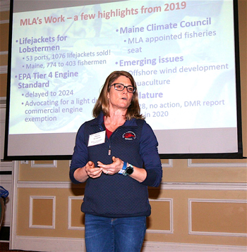 Patrice McCarron, Executive Director, Maine Lobstermen’s Association. “We believe management needs to be based on sound science and use the best available data. Maine will do its part, but the lobster fishery alone can’t solve this problem. Ten whales died in Canada last year. We couldn’t have solved that.” Laurie Schreiber photo.