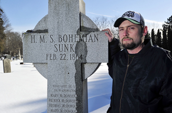 Historian Matthew Jude Barker stands with the Celtic cross honoring victims of the RMS Bohemian shipwreck – “HMS” was an error, he said – in South Portland’s Calvary Cemetery. Photo Gordon Chibroski/Portland Press Herald.