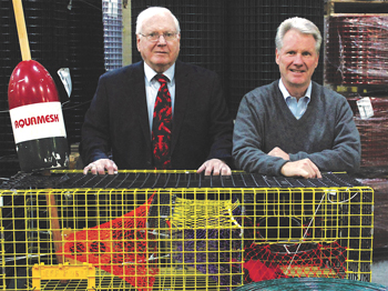 Jim Knott Sr., left, and Jim Knott Jr. at their Riverdale plant in Northbridge, MA. Aquamesh welded wire mesh, which Jim Knott Sr. developed, was used in the lobster trap shown. Aquamesh is made in the Northbridge plant and used in 80% of lobster traps. Riverdale Mills photo.