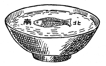 At least as early as 1040 A.D. a compass made with a magnetized metal fish floating in a bowl of water was used to indicate south. It was used to align construction projects. Overland traders are believed to have taken the idea to Europe around 1100 A.D., where it evolved into the marine compass.