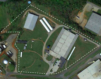 Blue Ridge Aquaculture, Martinsville, Virginia 2012. The 80,000 square foot build- ing, right, is the world’s largest indoor producer of Talapia. Blue Ridge ships 10,000 to 20,000 lbs. of talapia a day and 4.4 million lbs. annually. Nearly all the waste is recovered. The two long white greenhouses, top center, produce hydroponic plants in the recirculated fish tank water. Blue Ridge Aquaculture photo