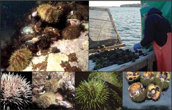 From its boom of 40 million pounds, the 2003-2004 urchin landings (which are still being tabulated) will probably come in at well below 6 million.(Photos Bob Steneck, University of Maine, Maine Department of Marine Resources) |