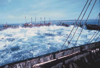 Several big boats form a circle to raise a tuna landing net off Bartate, Spain. The water is boiling with the large fish. The virtually unregulated Eastern Atlantic tuna fishery takes more than 10 times what the U.S. takes from the same tuna stock.