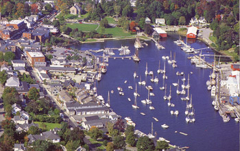 Valhalla, a term coined by author and sprawl critic Joel Kotkin, to describe an attractive town favored by the super-rich. It attracts starter castles and monster homes funded in part by federal tax law. That law allows interest and points on a principal of up to $1 million, to be deducted from income taxes every year. Mother-in-law coming for a visit? Not to worry, two of these residences and the real estate taxes can be deducted each year. In addition to raising the valuation of all homes in the harbor, the Mansion Subsidy induces tear-downs of buildings of scale and historic importance. Airphoto - Jim Wark, from A Field Guide to Sprawl, by Delores Hayden |