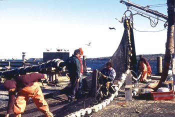 trawlers have gradually taken over the fishery because they fish more aggressively: towing a net behind one boat or between two boats pair trawlers they can target herring anywhere in the water column, day or night. Where purse seines once dominated, mid-water trawlers now land 70 percent of the nearshore herring, and several seiners have rigged over to the new gear.
