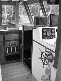 One of the things Kass has changed in his boats is the more visible attention to detail, generally around the wheelhouse, but also topsides and below. This detailing is not gobs of geegaws and doodads, but a grip rail, a varnished instrument panel, paneled lockers, a usefully-located light, a comfortable seat in an enclosed wheelhouse, easy access to the control panel, Douglas Fir decks and other custom features.