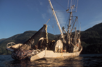 Above a salmon purse seiner in Johnstone Strait, British Columbia, Canada. Traditional salmon fishing operations have found it more difficult to compete with farm raised salmon in the marketplace.