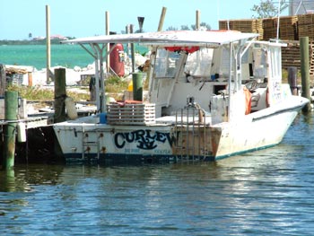 A typical lobster boat at Big Pine, Florida near Key West. The metal rack over the stern is where the wood trap is placed, flipped up, lobster removed and rebaited. Most fishermen use a stern puller. Photo Fishermen's Voice. |