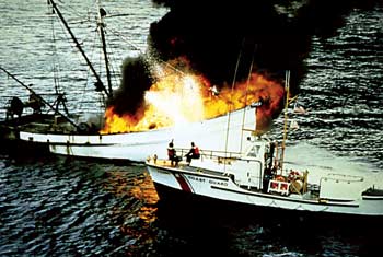 On Jan. 9, 2003, the 66-foot wooden shrimp trawler Capt. Adam, out of Tarpon Springs, Fla., was underway in the Gulf of Mexico when a fire broke out in the engine room. Attempts to extinguish the blaze failed and the fire burned out of control. Heavy black