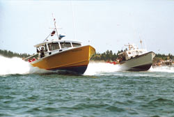 A battle is developing in Class A between Howard Gray, whose Blue Thunder took the cup in 2003 and 2004, and Chuck Williams Mjr. Weakeyes, who was second last year. Gray won at Moosabec, followed by Chris Beal in Little Ladies, Richard Alley in Family Alliances, and Patrick Kelley in Misty Mae. Williams, who did not race at Moosabec, placed first at Stonington ahead of Gray and was clocked on the radar at 30.7 mph. Beal was third and Chris Hutchinson in Minor Debt was fourth.