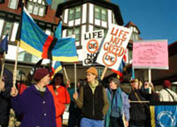 Protestors from the Passamaquoddy tribe and Save Passamaquoddy Bay outside the Fairmount Algonquin Hotel in St. Andres, N.B. on October 27th, protesting against the citing of an LNG terminal in Passamaquoddy Bay. Photo Gary Guisinger |