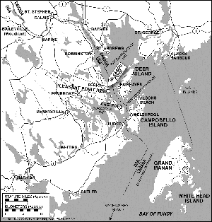 IThe approximate assumed freighter route to be used by 1,200 foot long LNG tankers carrying LNG to Pleasant Point, Maine. Map © 2004 Old Sow Publishing |