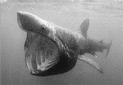 The basking shark, which lives in the Gulf of Maine, can grow to 34 feet and weigh 7 tons. It swims with its 3-foot wide mouth open filtering 1,000 gallons of water per minute through its gill rakers. The plankton and small sea animals collected this way are what it lives on. This sharks teeth are small and not much used. |