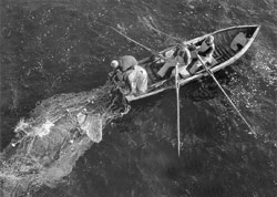 Towing in a basking shark off Achill Island on the west coast of Ireland. For a couple of months each year the sharks have been hunted with harpoons in traditional wood and canvas curraghs. This photo was taken in the mid 1980s. © Erwan Quéméré |