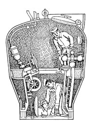 A cut-away drawing of the diving bell or chamber like the one used to rescue the crew of the Squalus. The chamber had existed, but Charles Momsen developed gear and techniques for its successful use in deep diving submarine rescue. |